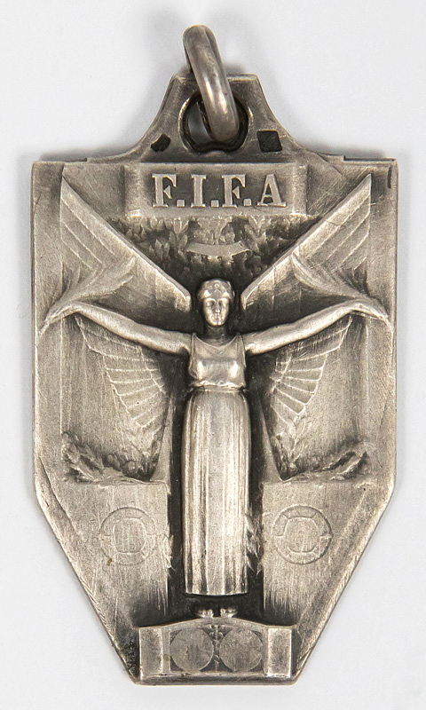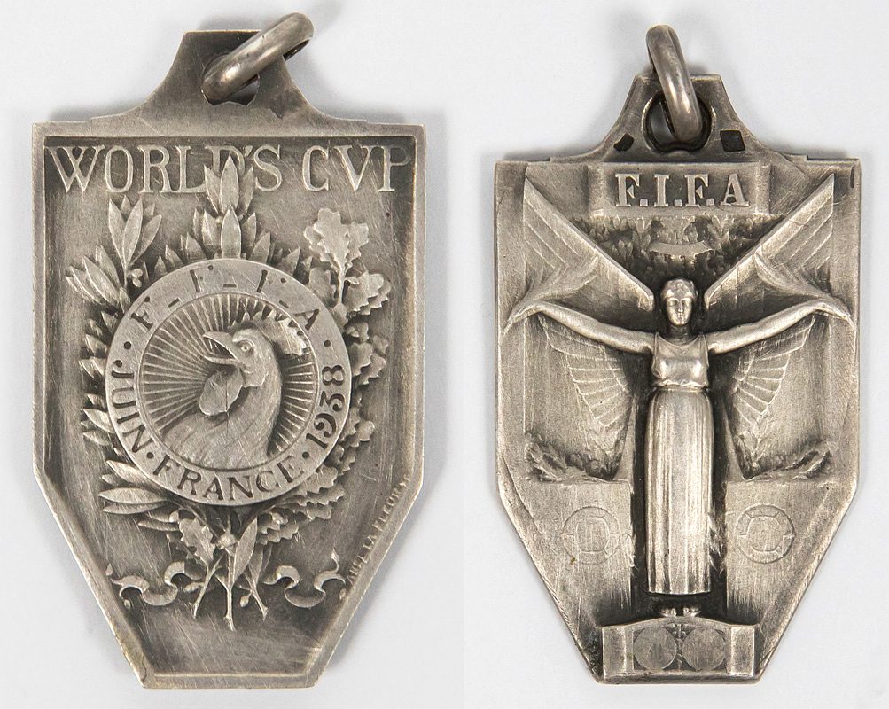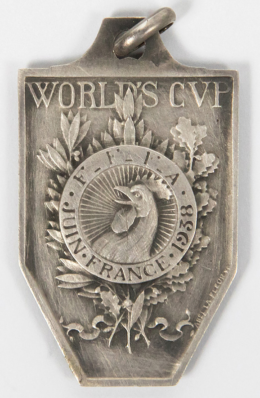 World Cup 1938. Runners Up Medal - Official winner's and participant's medal from the 3rd FIFA World Cup in France in 1938. This medal was awarded to the Hungarian team for their second-place finish at the 1938 World Cup. 13 medals were awarded to Hungary. This silver medal was also issued by the Organizing Committee to FIFA Executive Board members and high-ranking members of the Organizing Committee. Inscription: "World Cup France June 1938" Silver, stamped (7.6 g). Design: Abel Le Fleur. 3.6 x 2.2 cm --World champion Italy received this medal in gold (13 pieces). An absolute rarity! Extremely fine (EF). Condition: A