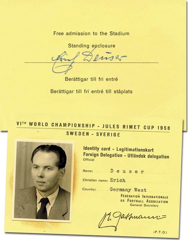World Cup 1958 German Team ID-Card - Official ID card for teams for the World Cup 1958. „VIth World Championship - Jules Rimet Cup 1958 Sweden. Identity Card Player.“ This copy belonged to German temamasseur Erich Deuser (1910-1993). With photo and original signature on rear. 13x9 cm. Condition: C