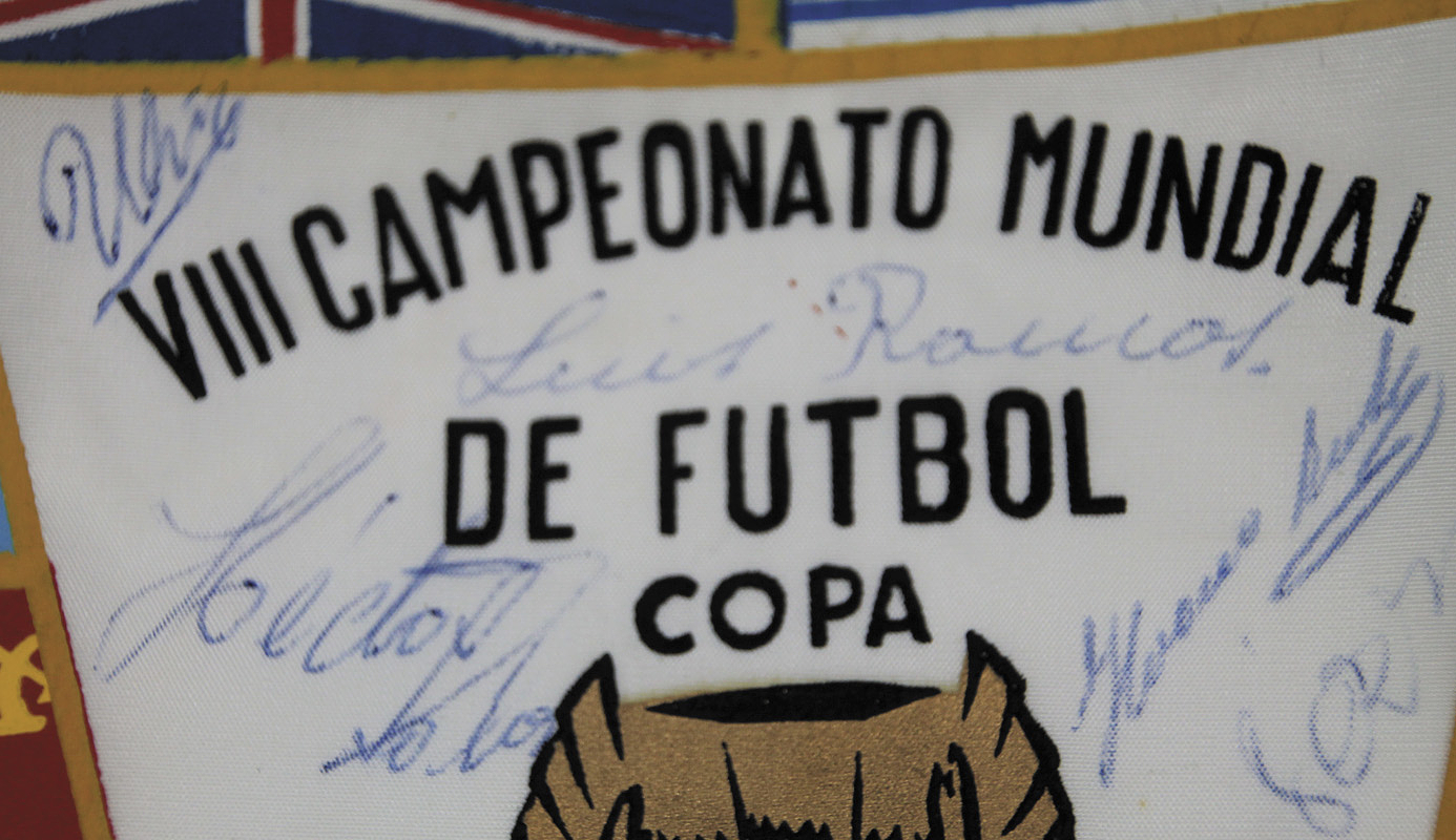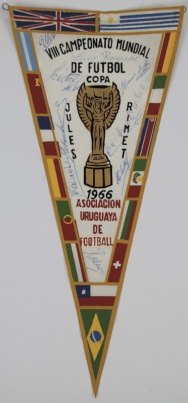 World Cup 1966 Autographed pennant Uruguay - Souvenir pennant of the Uruguayan Football Association for the 1966 FIFA World Cup with the inscription "VIII Campeonato Mundial de Futnol 1966. Associon Uruguay de Football" color printed, 35.5x17 cm With 11 original signatures of the Uruguayan players!! Condition: B-