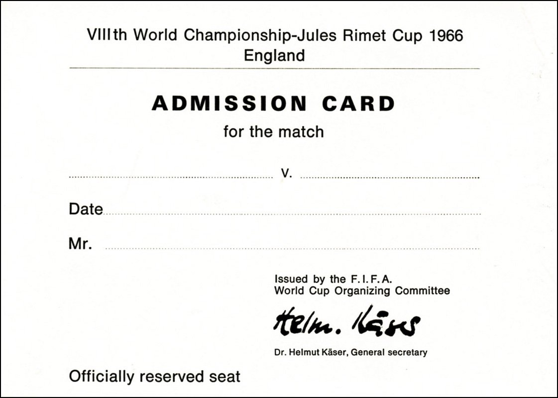 World Cup 1966 Official Admission Card Ticket - Admission ticket for the match…… Issued by the FIFA World Cup Organizing Committee. Officially reserved seat. Cardboard, 15x10.5 cm. Unused! Rare ticket issued by FIFA for the VIP stand in the stadiums of the 1966 World Cup. Was only issued to VIPs. Condition: A