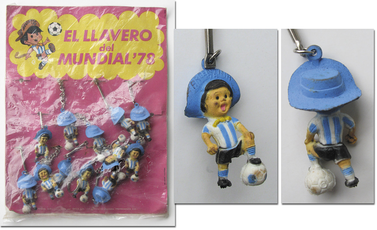 World Cup 1978. 12 Official Mascots Gauchito - „Gauchito“. Complete vending display on card board (28x21 cm) for the official mascot of Football World Cup 1978 in Argentina. 12 m/c plastic figures as key rings (size 5x2 cm each). Rarity! Condition: B-