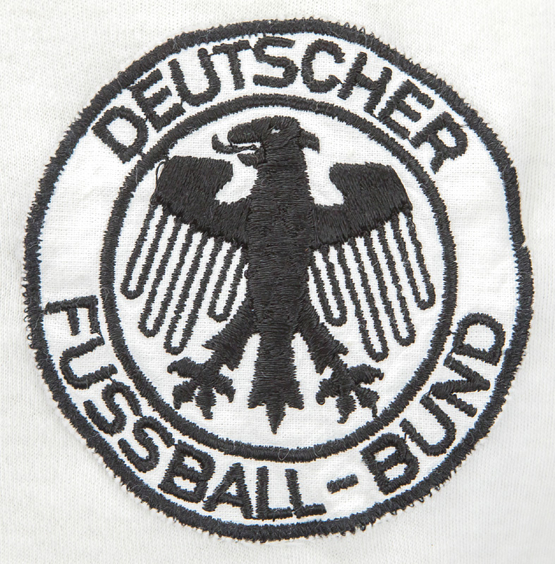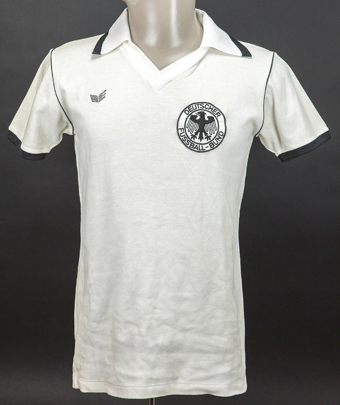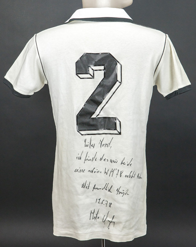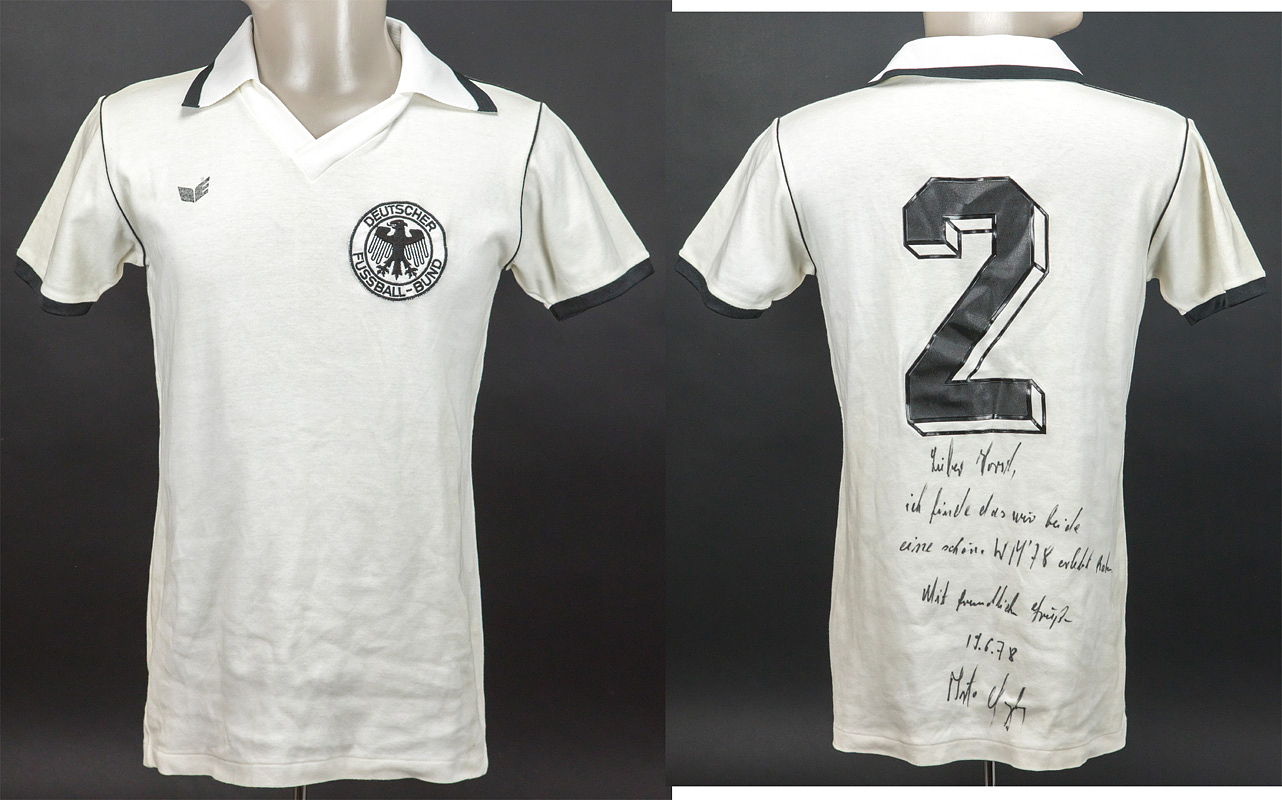World Cup 1978 match issue football shirt Germany - Original match-issued Germany player jersey with the number 2. Designed for Berti Vogts for a match at the 1978 FIFA World Cup in Argentina. Germany played all matches in long sleeves. With the original dedication from 1974 World Cup and 1972 European Championship winner Berti Vogts: "Dear Horst, I think we both had a wonderful World Cup 1978. Sincerely, 19.6.78, Berti Vogts." Status: ABA. --Short-sleeved jersey; size L=5/6; sewn-on DFB logo; printed erima logo; back number: plastic, thickly rubberized; erima. Berti Vogts gave this short-sleeved jersey to a DFB team coach after the Holland match during the FIFA World Cup. Condition: A