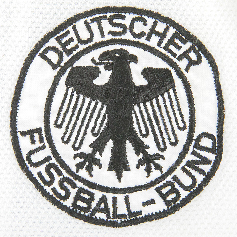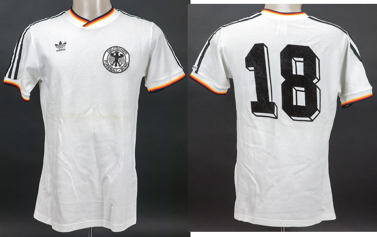 World Cup 1986 match issue football shirt Germany - Original match-issued Germany jersey with the number 18. Worn by Uwe Rahn (did not play) on June 25, 1986, in the 1986 FIFA World Cup semifinal against France. France lost 0-2 to Germany. Rahn was the 1986 World Cup runner-up. Exchange jersey! Status: AAA --One of the rarest and most sought-after German World Cup jerseys. --Short-sleeved jersey; size 7/8; sewn-on DFB logo; printed adidas logo; flocked back number; with Climalite 2000 tag on the left sleeve; adidas. A French international swapped the jersey with Rahn after the game. --minor storage wear Condition: A-