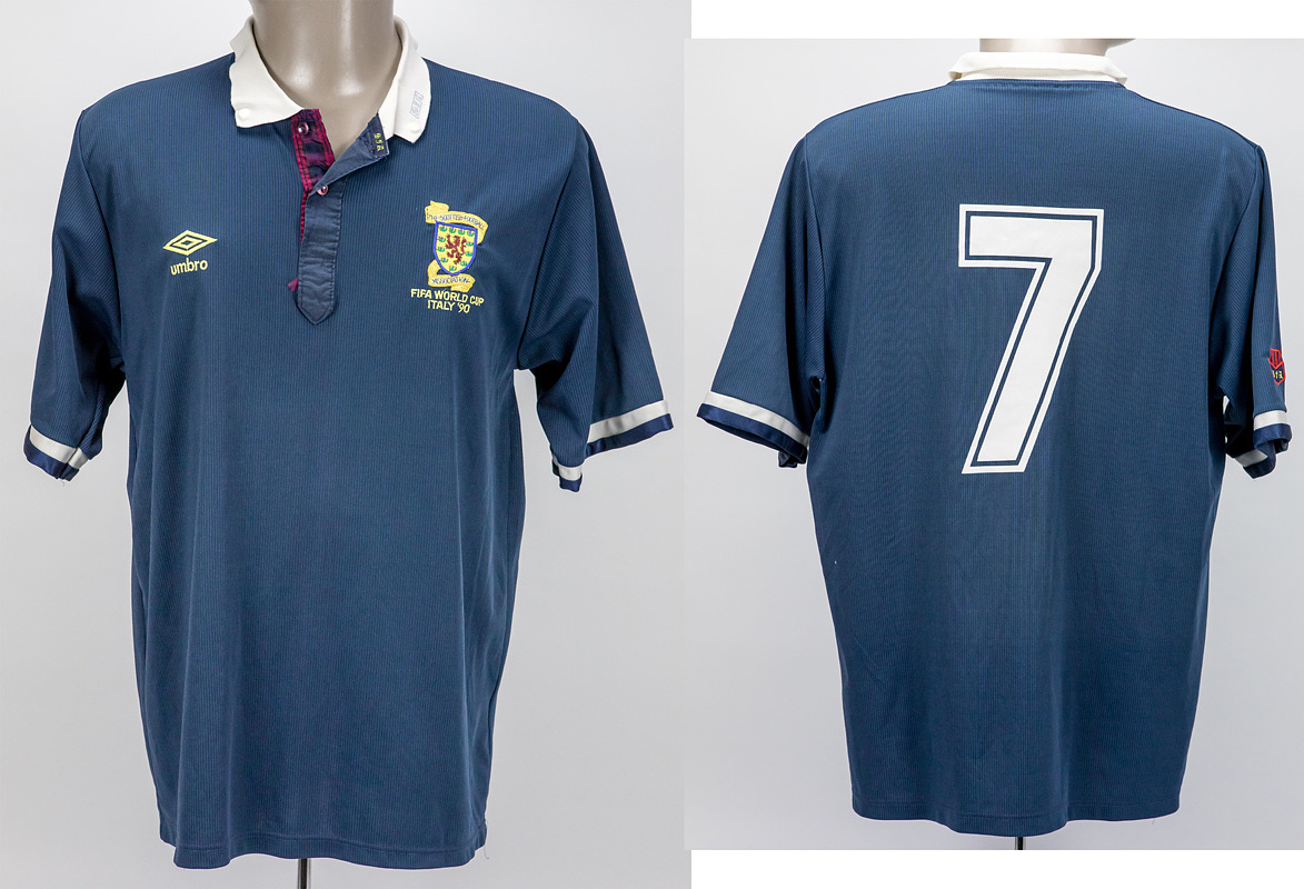 World Cup 1990 match worn football shirt Scotland - Original match worn Scotland player shirt with number 7. Worn by Mo Johnston in a group game (e.g. against Brazil) during the 1990 World Cup in Italy. Status:ABC --Short-sleeved jersey with button placket; Size approx. L; Association logo and lettering 'FIFA World Cup Italy '90' embroidered; flocked back number; Jersey has minor signs of wear (label washed out); umbro. Condition: A-