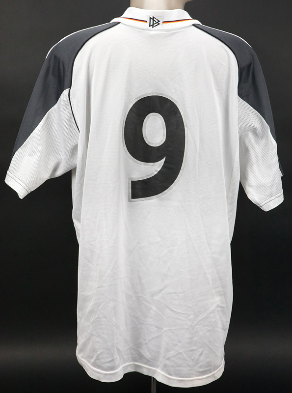 World Cup 2002 matchworn football shirt Germany - Original match-worn Germany shirt with the number 9. Worn by Oliver Bierhoff on October 7, 2000, in a World Cup qualifying match against England. England lost 0-1 to Germany. Exchange shirt. Bierhoff is the 1996 European Football Champion and the 2002 World Cup runner-up. Status: AAA --Short-sleeved jersey; size XL; embroidered DFB logo, three World Cup stars, and adidas logo; rubberized back numbers (front and back); 'DFB' lettering woven on the back of the collar; mesh fabric under the sleeves and on the sides; with equipment tag; adidas. Jersey comes from the collection of an England international who played in this international match. Condition: A