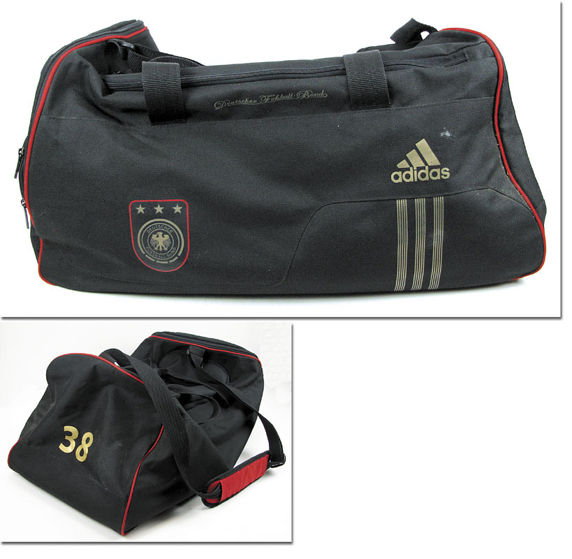 World Cup 2010 Adidas sports bag German team - Original piece of the World Cup equipment of the German national team with the number "38"! The players' bags were marked with their respective numbers during the World Cup! The coaches and trainers had numbers starting from 24. This is the large model for sportswear and shoes of the players and coaches. Signs of wear from use during the 1998 World Cup! Bag comes directly from a team member of the national team at the 2010 World Cup in South Africa. 50x34x30 Condition: C