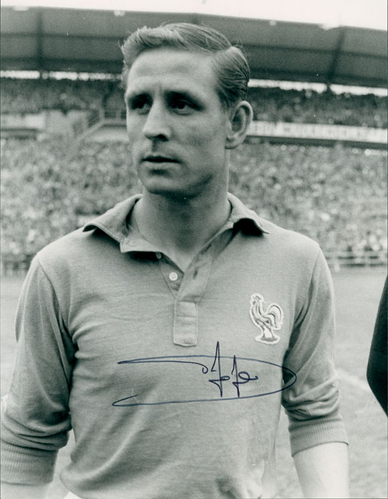 Autograph Football World Cup 1958. (1931-2017) Original signature on a black-and-white press photo of Raymond Kopa. French international football player, top scorer at the 1958 World Cup and third place at the 1958 FIFA World Cup. 22 x 16.5 cm. Condition: A