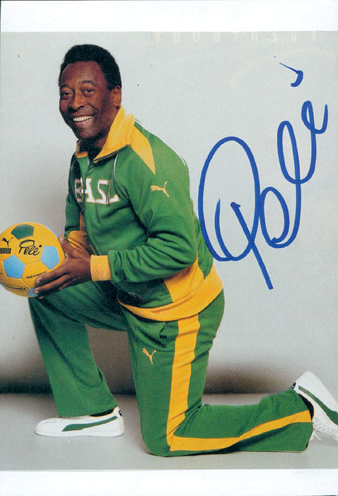 Autograph World Cup Champion 1970: (1940-2022) color magazine photo mit original signature of Pele. (Brazilian football - World Champions 1958, 1962 and 1970). 13x10 cm. face-to-face autograph given on 08.06.2006 at the Hotel Adlon in Berlin --Magazine photo mounted on cardboard Condition: B