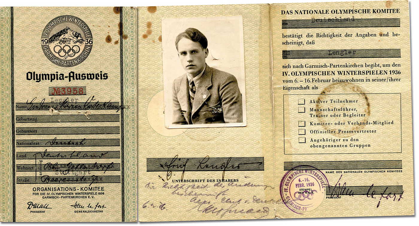 Olympic Winter Games 1936. Identity Card: ID of the Olympic Winter Games Garmisch-Partenkirchen 1936 no. 3012. with photo and original signature. Ids of the Olympic Winter Games 1936 are extremely rare. 4 pages, 14x9 cm, carton. -- Taped with adhesive tape; stained; minor damage Condition: C
