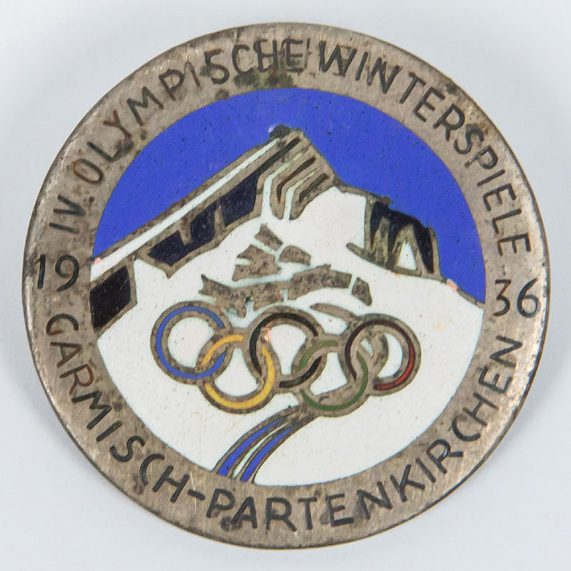Olympic Games 1936 Garmisch-Partenkirchen. Official Visitor's Pin. Bronze, silver plated, with coloured enamel, size 3.5 cm, --slightly tarnished. Small chip Condition: B+