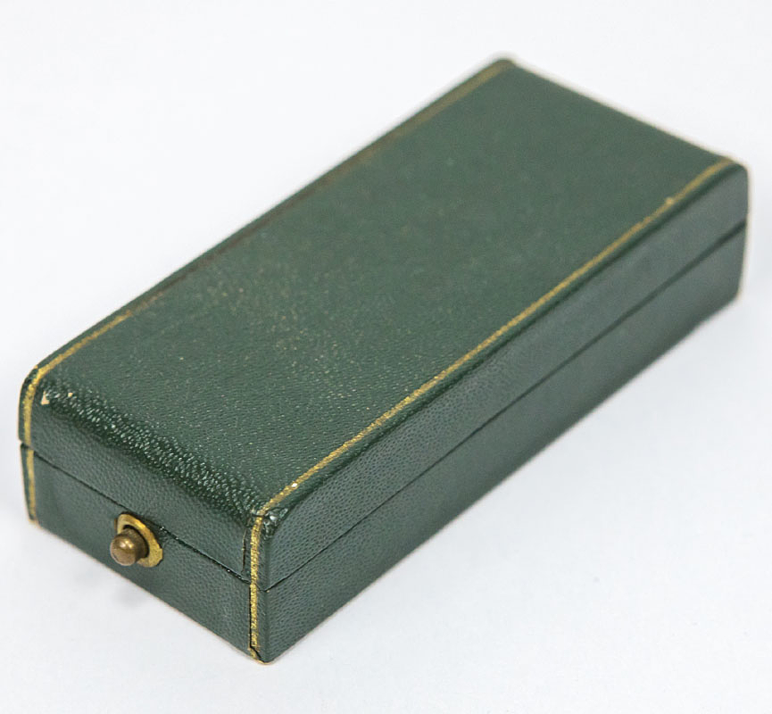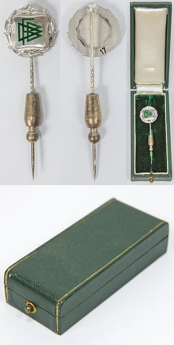 Golden pin of honour of the DFB with wreath for honorary members of the DFB. One of the highest awards of the German Football Association. White gold, enamelled green (stamped 525, weight: 3.56 grammes without cap). Numbered copy no. 17. 1.7 cm. According to the DFB honorary regulations, this award was given in gold. Mostly these pins are in yellow gold, the white gold version is extremely rare. Approximately 120 of these awards have been issued to date. In original Box! Condition: A