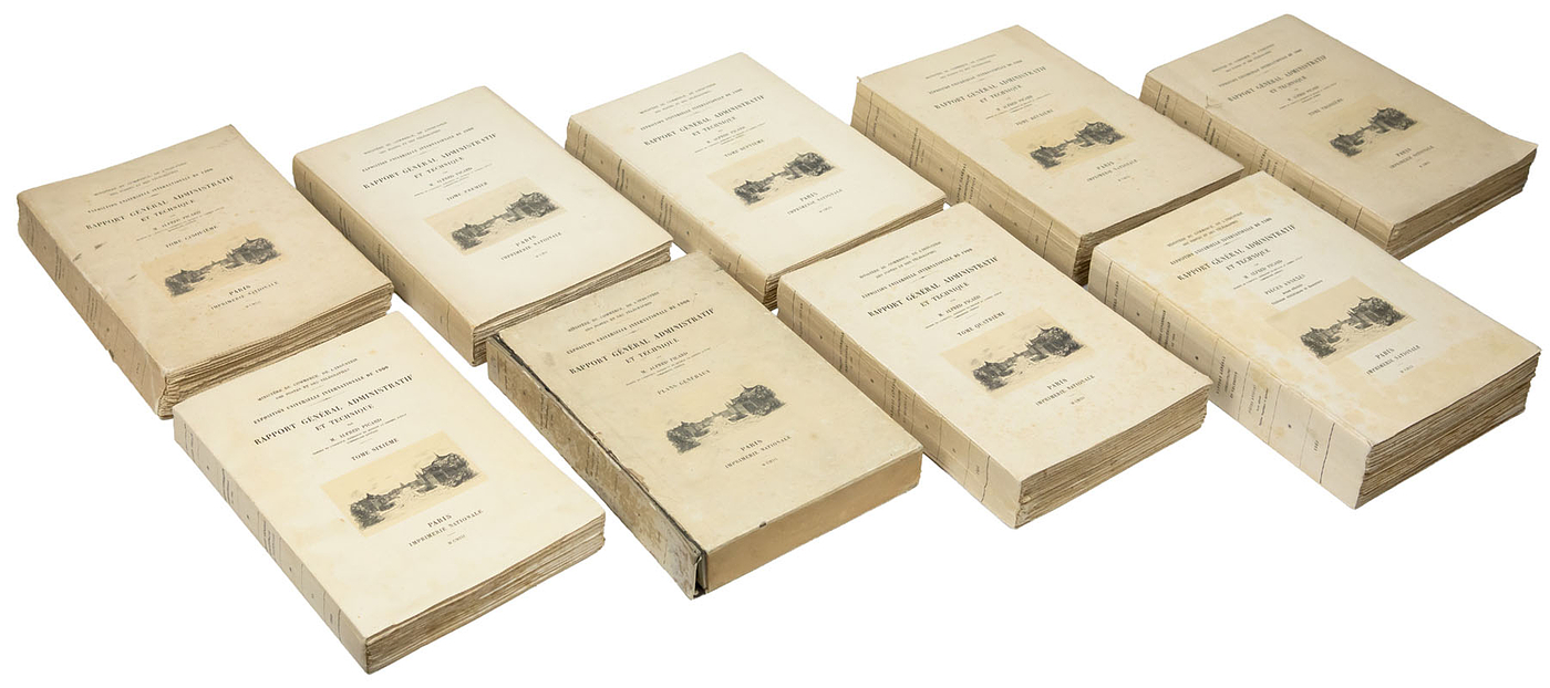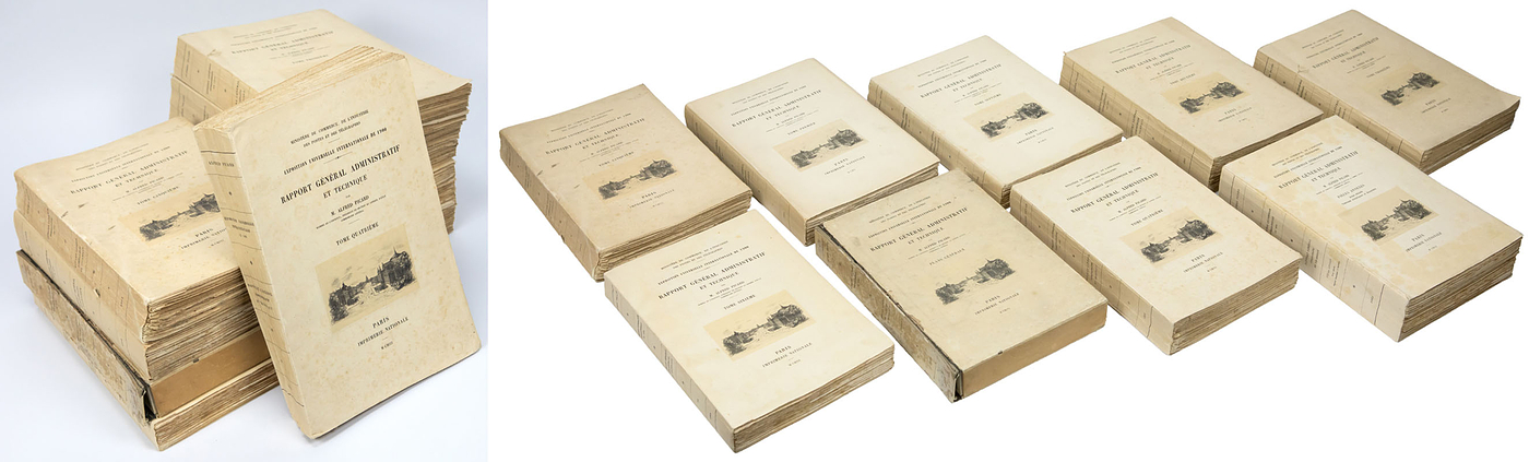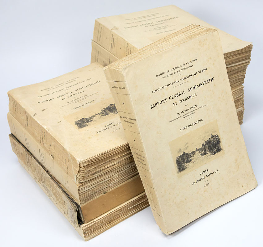 Olympic Games 1900 Final Report World Exhibition. Very rare report in seven volumes plus supplement and a box with maps about the World's Fair in Paris 1900 during which the Olympic Games 1900 took place. Includes the 6th volume of the official report. Volume 6 deals with the Olympic Games in details. This volume describes the organisation of the Olympic Games, tells about tickets, passports and concerts on occasion of the Olympic Games, events and award ceremonies. Exposition Universelle Internationale de 1900. Rapport Géneral Administratif et Technique. Tome 1-7 + Pieces Annexes + Plans General. Tome sixiéme. Has not been cut open. Slightly foxed. Condition: C