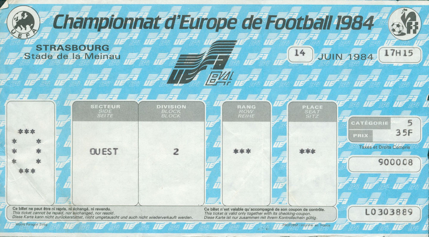 Ticket: UEFA Euro 1984 Germany v Portugal on June 14th, 1984 in Strasbourg. Size18x10 cm. -- folded, Condition: C
