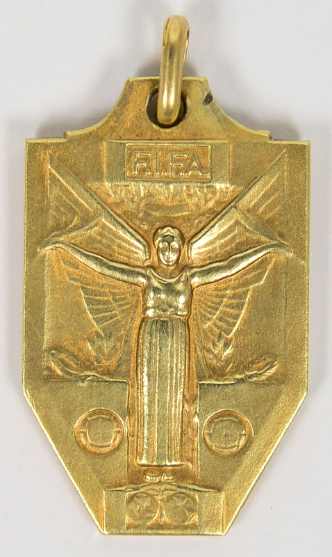 FIFA World Cup 1950. Runners up medal: Official winner's medal for Uruguay, the winner of the 4th FIFA World Cup in 1950 in Brazil. Medal of Viktor Rodriguez Andrade (1927-1985). "Coupe Jules Rimet World Cup Brazil 1950." Gold (18-karat tested by a jeweler). Engraved with the initials "RA" (Rodriguez Andrade), 3.6 x 2.3 cm. There was no final at the 1950 FIFA World Cup in Brazil. The world champions were determined from a group of four teams. Uruguay won the championship. The world champions received this gold medal (13 copies). All other teams in this final group received 13 copies of this medal, but in silver (FIFA World Cup regulations 1950). All medals were issued without name engravings. The Uruguayan players in particular had their names or initials engraved afterwards! The gold medals of Ruben Moran and Roque Maspoli, which were sold at auction in recent years (hammer prices 20,000 and 24,000 GBP respectively), also had the players' names engraved, but both with simple engravings of the full names. Neither medal had a gold hallmark, but were made of 18-karat gold. Andrade's medal comes from an English collection. The collector acquired this medal at an English auction in early 2000. MUSEUM COPY! Condition: A