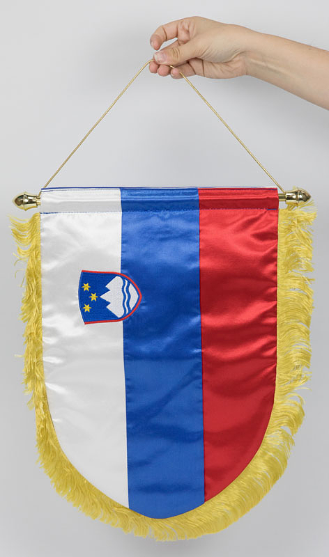 Original match pennant of the Slovenia national team with embroidered match details "UEFA Nations League Austria v Slovenia 17.11.2024 Vienna." Printed silk pennant with silk fringes. Reverse in the national colors and an embroidered national coat of arms. Gold-plated plastic pole, 45 x 35 cm. --This pennant is the original exchange pennant, which was handed over by the Slovenian captain to the Austrian captain! It came from the collection of an official of the Austrian Football Association, who took the pennant at the start of the game and was allowed to keep it! Condition: A