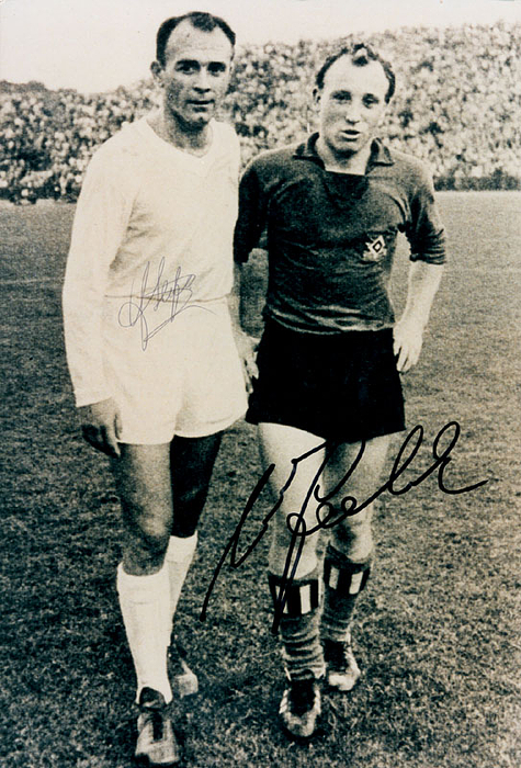B/W large repro photo from 1963 with the original autographs by Alfredo Di Stefano and Uwe Seeler, 30x20 cm Condition: A