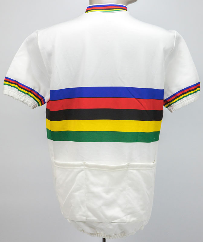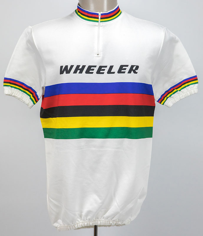 Original cycling jersey for a German 1999 4000m Team Pursuit World Champion. Rainbow jersey with the advertising slogan "Wheeler." Status: ABC --Size: 6. --This jersey was worn in a 1999/2000 Bahr cycling race by an athlete from the 1999 World Champion team. Condition: A
