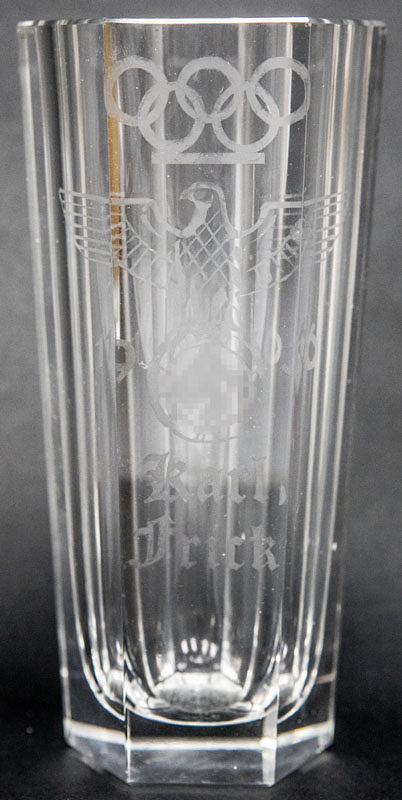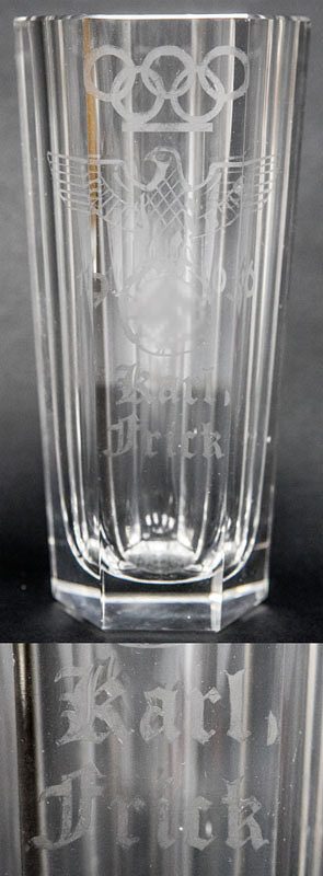 Lead crystal glass trophy with etched Olympic rings and the year 1936. The imperial eagle with swastika and the initials "Karl Frick" are etched into the trophy. Weight: 600 grams. 16 cm. --Commemorative Cup on the occasion of the 1936 Olympic Games Condition: A