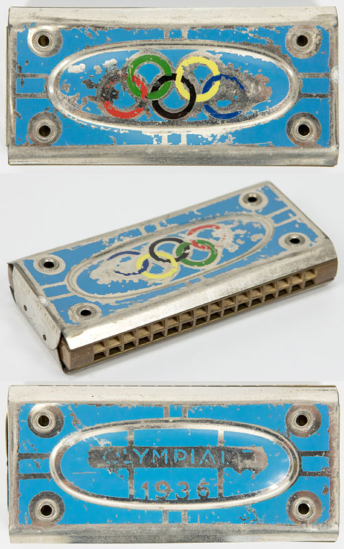 Harmonica (fully functional). Advertising print with colored Olympic rings and the inscription "1936 Olympics." 11.5 x 5.5 x 2 cm. --A very rare souvenir from the 1936 Olympic Games. Paint flaking due to use. Otherwise, the musical instrument is in very good condition! Condition: C