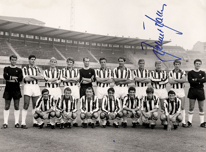 Black & white pressfoto Juventus Turin with Originalautograph of German international Helmut Haller one of the players on the picture. 23x17 cm Condition: A