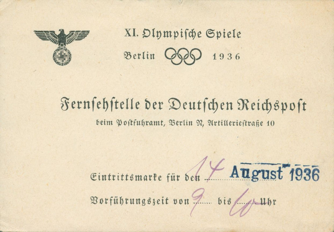 Television station of the Deutsche Reichspost at the Postfuhramt Berlin, Artellierstraße10. Admission ticket for 14th August 1936 from 9 to 10.00 am. Official ticket from the Olympic Games Berlin 1936, 10.5x7.5 cm. Very rare admission tickets for the first live broadcasts of Olympic Games on television! Condition: B