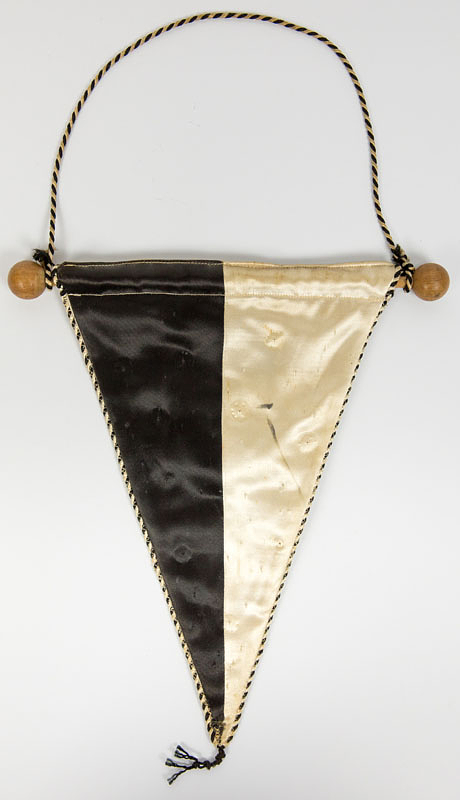 Original VfB Königsberg match pennant, circa 1930. Silk pennant with black embroidered club logo "VfB" and the inscription "Königsberg von 1900." Black and white silk border with silk pompom remnant. Original black and white silk cord. Wooden pole with wooden balls, 25 x 18 cm (without pompom). --A truly rare item! Match pennants from this era are hard to come by. There were no souvenir pennants yet! VfB Königsberg is one of Germany's top clubs from East Prussia. They were 5-time East Prussia Gau champions and participated in the finals of the German football championship 16 times. The club was dissolved in 1945 when Königsberg was annexed by the USSR. The pennant was used as a pincushion, meaning numerous football pins were pinned to it. Therefore, there are numerous pinholes on the front and back. There is a small damage to the bottom of the front. Condition: C
