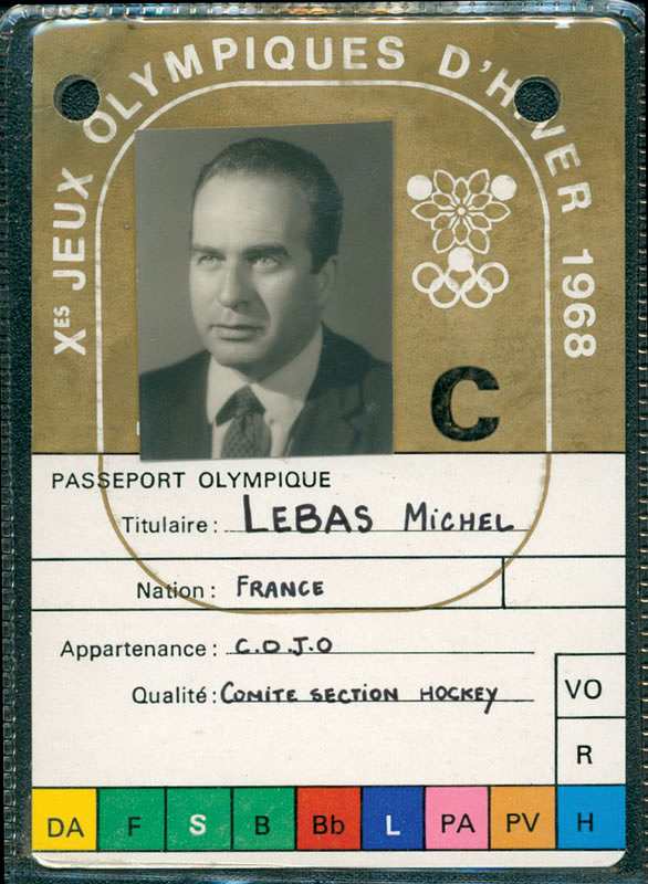 Olympic Games 1968 Grenoble. Identity card: "Olympique Passport. Grenoble 1968. COJO - Hockey Section Committee. Michel Lebas." For the head of the Hockey Section Committee. Original plastic sleeve. 11 x 8.5 cm Condition: A