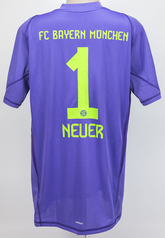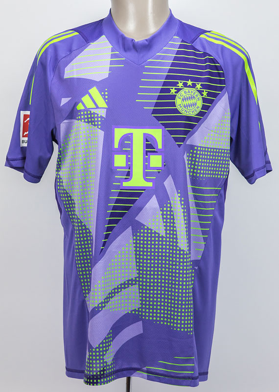 Original match-worn Bayern Munich goalkeeper shirt with the number 1. Worn by Manuel Neuer in a Bundesliga match during the 2024/2025 season. Neuer is the 2014 FIFA World Cup winner. Status: ABB --Goalkeeper jersey, short sleeve; size XL; gummed club logo, 5 Champions stars, and adidas logo; gummed '-T-' advertising print; gummed player name, number, and 'FC Bayern München' lettering; with BL patch and Allianz patch; adidas Aeroready. Jersey comes from the collection of an FC Bayern Munich employee. Condition: A