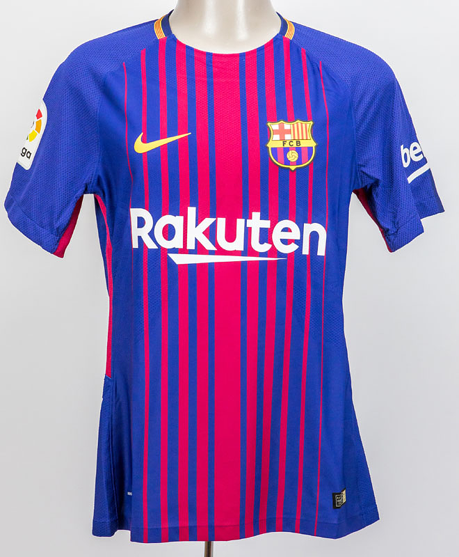 Original match-worn FC Barcelona shirt with the number 8. Worn by Andrés Iniesta in a Spanish LaLiga match during the 2017/2018 season. Iniesta is a 2010 World Cup winner and a 2008 and 2012 European Champion with Spain. Status: ABC --Short-sleeved jersey; size M; rubberized club emblem and Nike logo; rubberized 'Rakuten' advertising print; rubberized back number, player name, and 'UNICEF' lettering; with LaLiga patch and Beko patch; Nike Aeroswift. Condition: A
