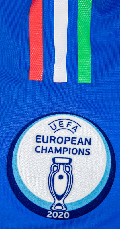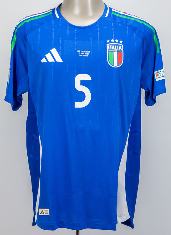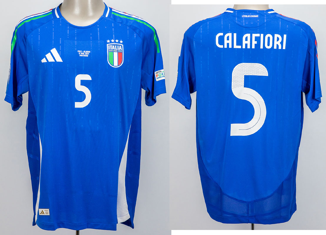 Original match-worn / issued Italy shirt with the number 5. Worn by Riccardo Calafiori on June 15, 2024, in a European Football Championship group match against Albania. Italy 2-1 Albania. Status: AAC --Short-sleeved jersey; size L; rubberized association logo, 4 World Cup stars, adidas logo and match details; rubberized player name and number (front and back); rubberized 'L'Italia Chiamo' lettering on the back of the collar; with UEFA European Champions 2020 trophy patch and UEFA Foundation for children patch; adidas Heat.Rdy. Condition: A