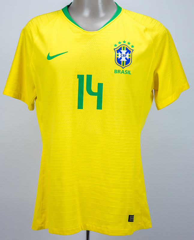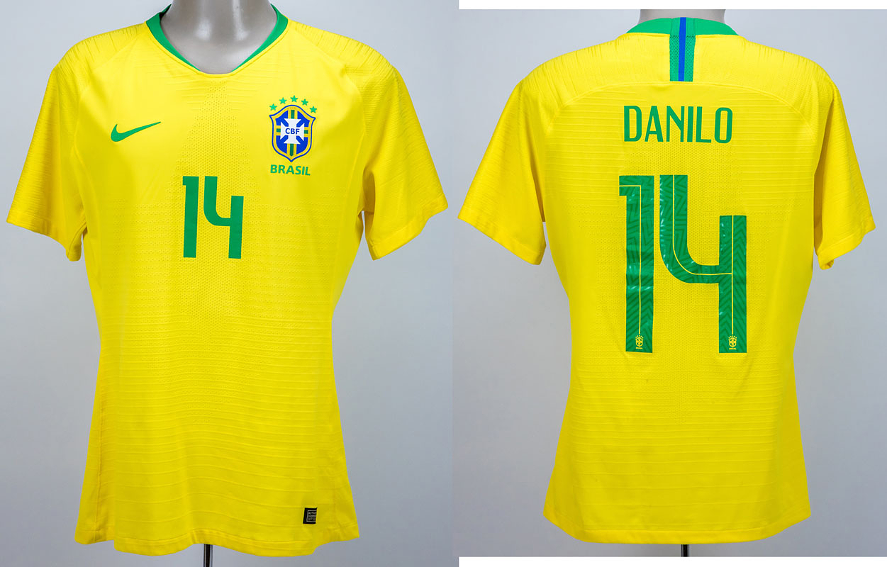 Original match-worn Brazil shirt with number 14. Worn by Danilo (Luiz da Silva) in the friendly against Croatia on June 3, 2018. Brazil - Croatia 2-0. Unwashed. Status: AAB --Short-sleeved jersey; size L; rubberized federation logo, 5 World Cup stars, Brasil lettering, and Nike logo; rubberized player name and number (front and back); jersey was worn in the second half, is unwashed, and has play wear (stains); Nike. Jersey comes from a kit manager of the Croatian national team. Condition: A-