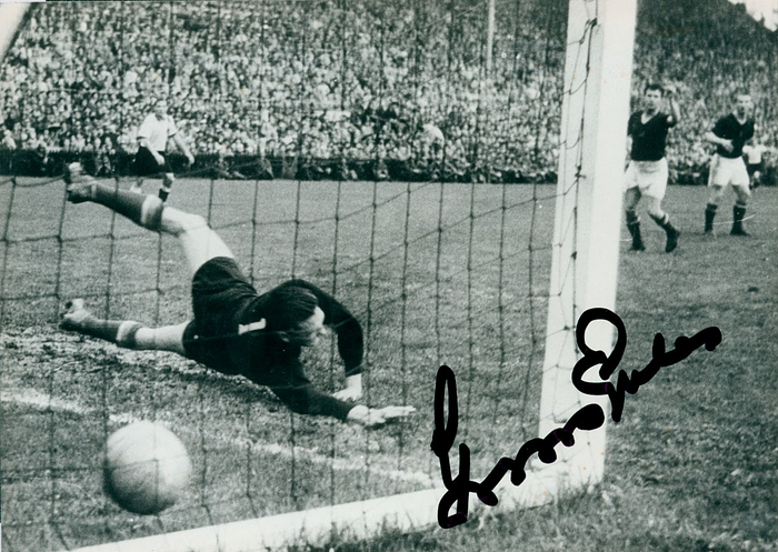 Black and white reproduction photo from the final of the 1954 Football World Cup of the decisive goal for 3:2 with original signature of Gyual Groscis (1926-2014), the goalkeeper of Hungary, 17.5x12.5 cm. Condition: A
