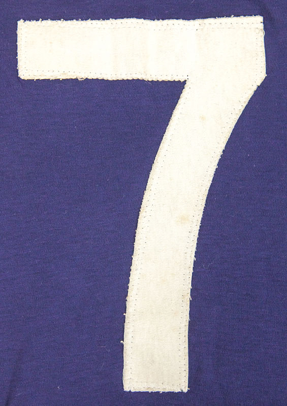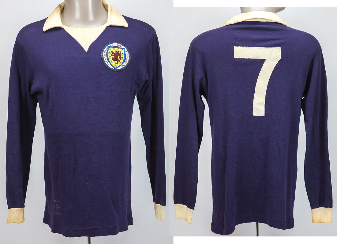Original match worn Scotland shirt with number 7. Worn in an international football match around 1972: ABC. Long-sleeved jersey; size approx. L; embroidered federation logo sewn on. Umbro logo printed in gold at the bottom left. Sewn-on back number; Umbro international. This jersey comes from a collection; unfortunately, the player who wore it is unknown. The match is also unknown. However, Scotland wore this jersey in 1972, for example, against England. Condition: B