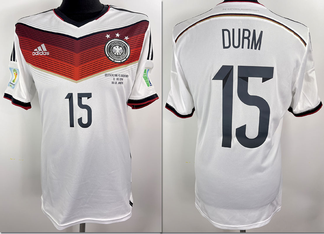 Original match-issued DFB player shirt with number 15 worn by Erik Durm. Designed for the 2014 World Cup final between Germany and Argentina on July 13, 2014, in Rio de Janeiro, Brazil, which the German national team won thanks to a goal by Mario Götze. Status:AAB Short-sleeved shirt; size 8; DFB logo, rubber-applied Adidas manufacturer logo, rubber-applied match detail, player number, and player name; flocked 2014 World Cup patch and Football For Hope patch; UV-tested; Adizero; 100% polyester; Made in China; Condition A; Status AAB Condition: A