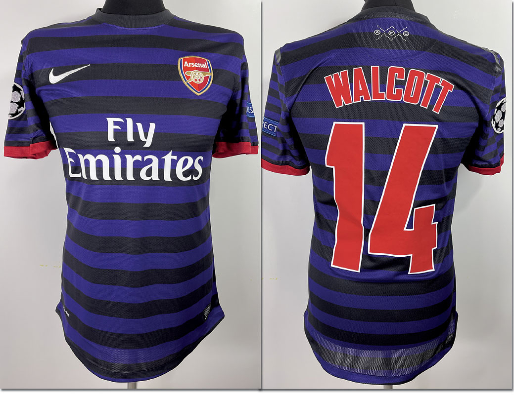 Original match-issued Arsenal London player shirt with number 14 of Theo Walcott Jesus. Prepared for the Champions League match against FC Bayern on March 13, 2013. Walcott wore a long-sleeved jersey in this match. Status:AAB --Short-sleeved shirt; size M; embroidered club emblem, Nike manufacturer logo; rubber-embossed player number and name, and sponsor 'Fly Emirates'; flocked Champions League patch and Respect patch; 100% polyester; Made in Thailand; Shirt comes from a kidman of the FC ayern Munich Condition: A