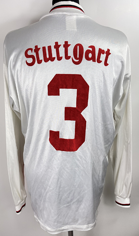 Original match worn VFB Stuttgart player shirt with the number 3. Worn in a Bundesliga match by Michael Frontzeck in the 1992 season. Frontzeck made 19 appearances and finished runner-up with the German national team at the 1992 European Football Championship in Sweden. Status:ABB Condition: B