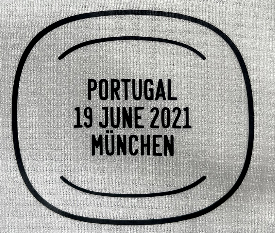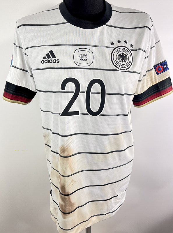 Original match-worn DFB player shirt with the number 20. Worn by Robin Gosens in the European Championship match against Portugal on June 19, 2021 in Munich. Shirt comes from the collection of a former DFB employee. Set consists of jersey and shorts. Status: AAB Short-sleeved jersey; size 50; DFB logo, rubberized Adidas manufacturer logo, match detail, rubberized player number and player name; flocked European Championship patch and Respect patch; Adidas HEAT.RDY; 100% polyester; Made in Cambodia; Condition: A
