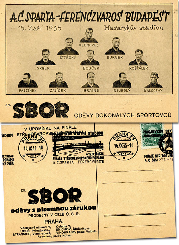 Official postcard from the final of the Mitropa Cup 1935. Sparta Prague - Ferenczvaros Budapest in Prague on 15th September 1935. With portraits of Sparta players. Special postmark on rear. Sparta won the finals (3:0/1:2), 15 x 10.5 cm. Very rare postcard. Mitropa Cup was the predecessor of the European Cup. It was held 12 times (until 1939). Top team from seven countries participated (CSSR, Austria, Hungary, Romania, Yugoslvia, Italy and Switzerland). Austria Vienna won the Cup in 1936. Beautiful copy. Condition: A