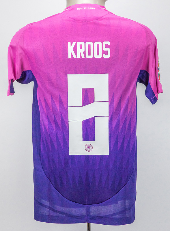 Original match-issued Germany jersey with the number 8. Designed for Toni Kroos on June 19, 2024, in a group match of the European Football Championship against Hungary. Germany - Hungary 2:0. Kroos is the 2014 World Cup winner. Status: AAB --Away short-sleeved jersey; size S; DFB logo, 4 World Cup stars, and adidas logo rubberized; match details, player name, and number (front and back) rubberized; 'Deutschland' lettering rubberized on the back of the collar; jersey with UEFA Euro 2024 Trophy patch and UEFA Foundation for Children patch; adidas Heat.Rdy. Jersey comes from a DFB employee Condition: A