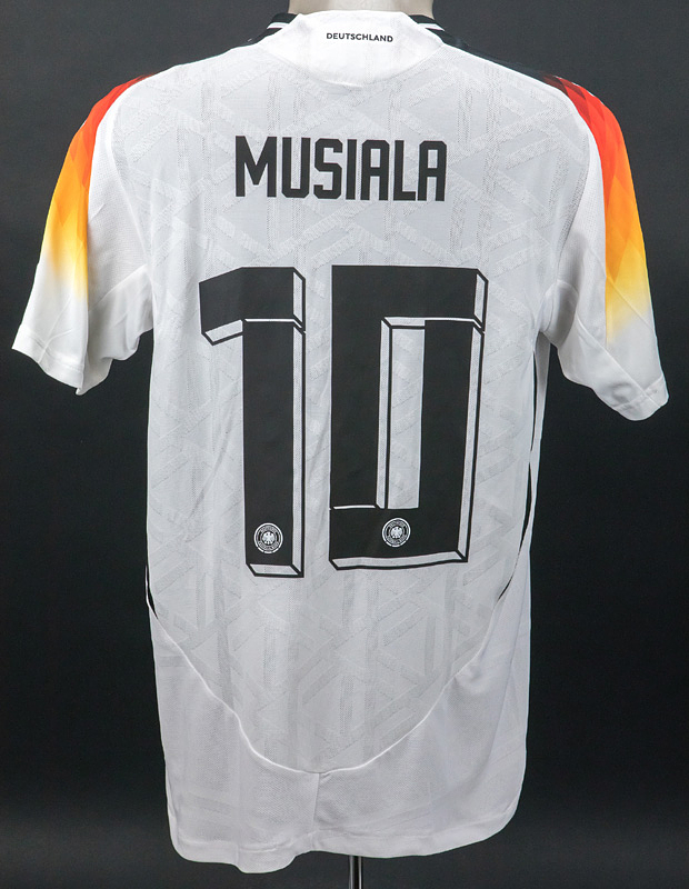 Original match-worn / issued Germany shirt with the number 10. Worn by Jamal Musiala on June 29, 2024, in the round of 16 of the European Football Championship against Denmark. Germany - Denmark 2-0. Status: AAB --Short-sleeved jersey; size M; DFB logo, 4 World Cup stars, and adidas logo rubberized; match details, player name, and number (front and back) rubberized; 'Deutschland' lettering rubberized on the back of the collar; jersey with UEFA Euro 2024 Trophy patch and UEFA Foundation for Children patch; adidas Heat.Rdy. Jersey comes from a DFB team kitman Condition: A