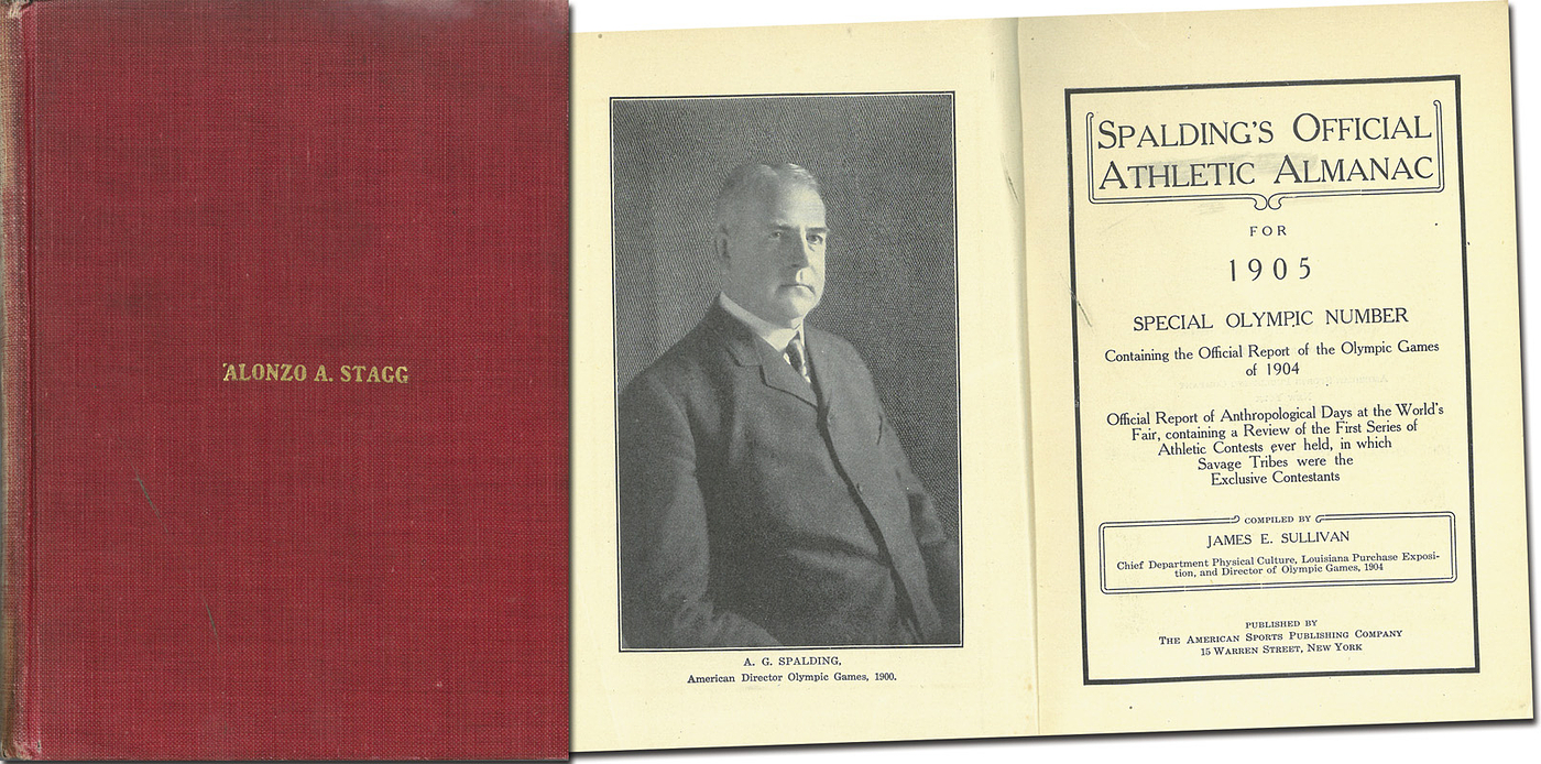 Spaldings Official Athletic Almanac for 1905. Olympic Games Number. (Official Report). Privates Exemplar von Alonzo A.Stagg! 284 + 30 pages with approx. 120 B/W photos, 17.5x12.8 cm private cloth, New York 1905. --One of the rarest "official" reports on the Olympic Games. This almanac is a special edition of the 1904 Olympic Games in St.Louis and reports exclusively on these games. Recognized as an Official Report!! --Alonzo A.Stagg (1862-1965), "athletics coach of the American team at the 1904 Olympic Games in St. Louis[1] and from 1906 to 1933 member of the board of the American Olympic Association as a representative of the universities or their predecessor organization. [2] At the 1924 Summer Olympics in Paris, he was once again one of the coaches of the American track and field team" (wiki). Players and coaches in the field of college football. He served as a football coach at various universities in the USA from 1890 to 1946. --Binding heavily loosened; Back faded. Good copy inside! Condition: C