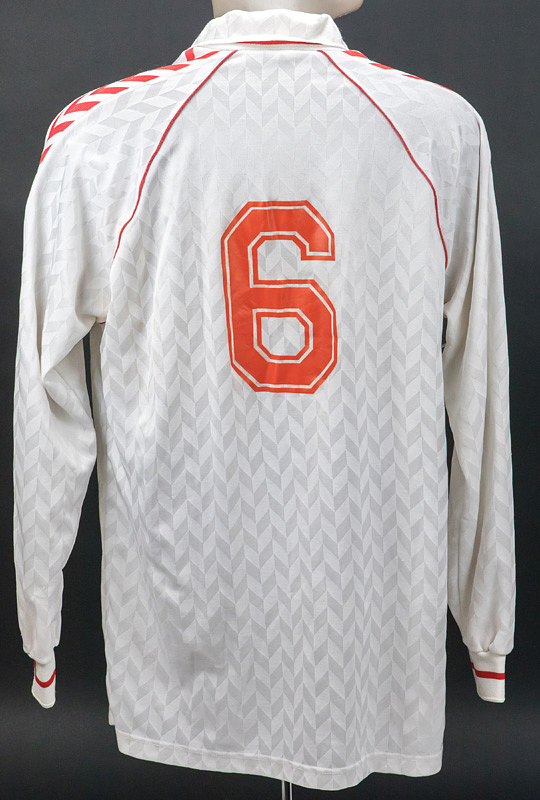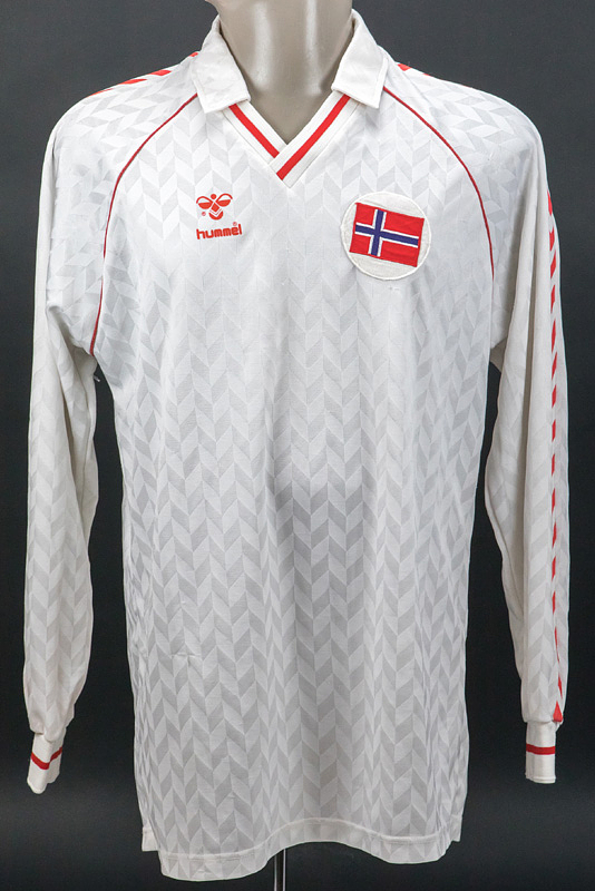 Original match worn shirt of Norway with the number 6. Worn in a friendly match for the Norwegian national football team in 1988. Status: ABC --Long-sleeved jersey; size XL; embroidered federation logo; rubberized hummel logo; rubberized back number; jersey has minor signs of wear; hummel. Condition: A-
