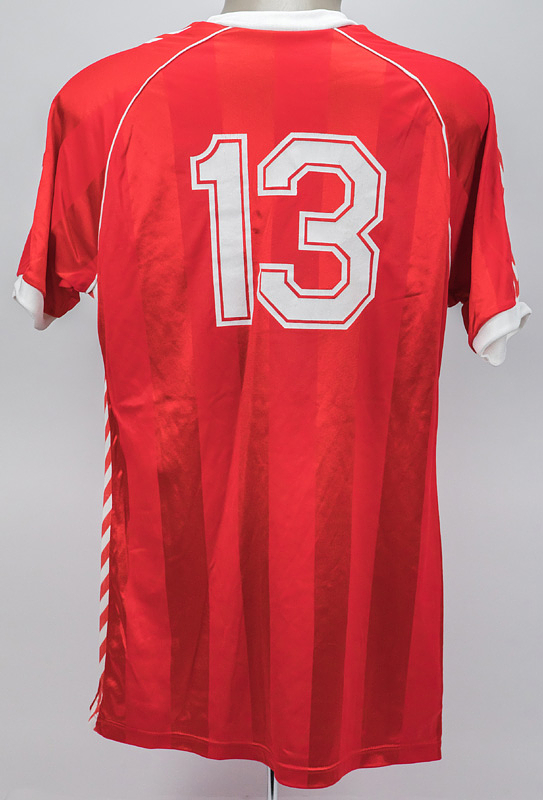 Original match-worn Norway shirt with number 13. Worn on April 30, 1986, in a friendly against Argentina. Norway won 1-0. Kjetil Osvold scored the winning goal. Status: AAC --Short-sleeved jersey; size XL; embroidered federation logo; printed hummel logo; rubberized back number; jersey has signs of wear (back number slightly cracked, label faded); hummel. Condition: A-