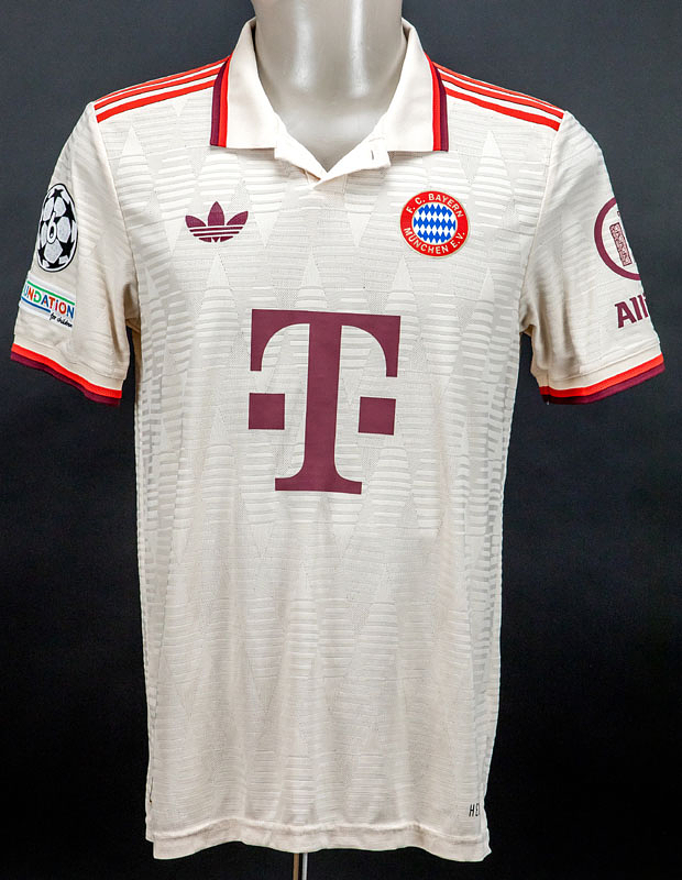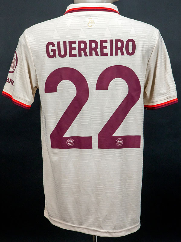 Original match-worn Bayern Munich shirt with the number 22. Worn by Raphael Guerreiro in a UEFA Champions League match during the 2024/2025 season. Guerreiro has been capped 65 times by Portugal. Status: ABB --Short-sleeved jersey with button placket; size 5; rubberized club logo and adidas logo; rubberized '-T-' advertising print; rubberized player name and number; rubberized 'FCB' lettering on the back of the collar; with CL Starball 6 patch, UEFA Foundation for Children patch, and Allianz patch; adidas Heat.Rdy. Jersey comes from an FC Bayern employee. Condition: A
