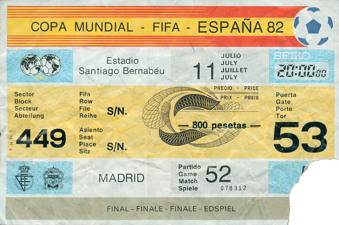 FIFA World Cup 1982. Final Ticket Italy v Germany (3-1), Size 10x15 cm -- heavily creased Condition: C
