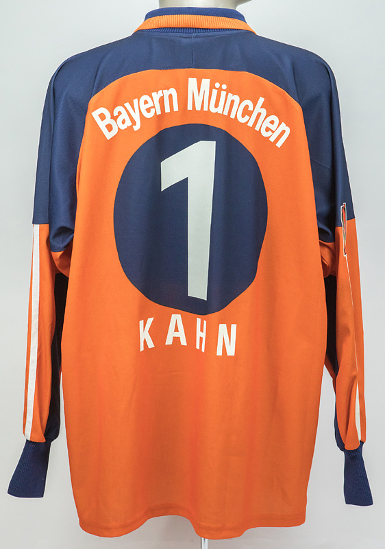 Original match-worn Bayern Munich goalkeeper shirt with the number 1. Worn by Oliver Kahn on March 17, 2001, in a Bundesliga match against TSV 1860 Munich. 1860 - Bayern 0:2. Rare jersey version. Kahn is a 1996 European Football Champion and a 2002 World Cup runner-up. Status: AAC --Long-sleeved goalkeeper jersey with arm pads; size XL; flocked club logo; embroidered adidas logo; flocked 'Opel' advertising print; flocked player name, back number, and 'Bayern München' lettering; with BL patch; jersey with climalite tag; adidas climalite. Condition: A