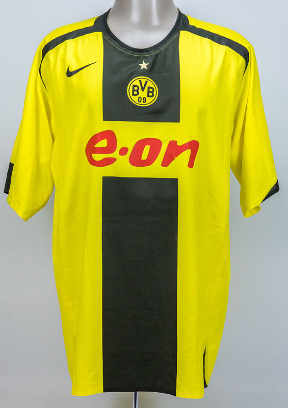 Sorry, no english description is available. ... Condition: A-.....Trikot kurzarm; Größe XXL; Vereins-Logo, 1 Meisterstern und Nike-Logo gummiert; Werbeaufdruck 'e-on', Rückennummer, Spielername und Schriftzug 'Dortmund' gummiert; Netzstoff seitlich eongelassen; Trikot hat Spielspuren (kleine Fehlstelle auf e-on Logo); mit BL Patch; Nike. Der Einlieferer hat dieses Trikot direkt von Jurica Puljiz bekommen der für Eintracht Frankfurt spielte.
