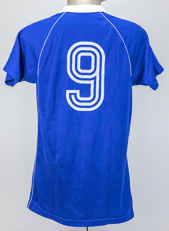 Original match worn / issued player shirt from the GDR with the number 9. Worn in a friendly match for the GDR national football team around 1980. Status: ACC --Short-sleeved jersey; size L=7/8; embroidered federation logo; printed adidas logo; rubberized back number; jersey has signs of wear (adidas logo slightly faded); adidas. Condition: A-