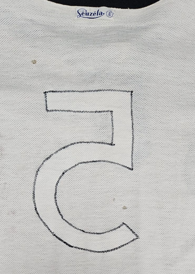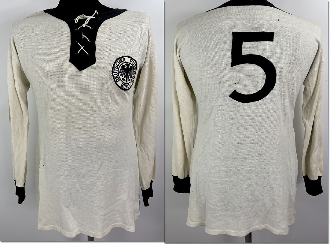 Original match-worn DFB player shirt with the number 5. Worn by Heinz Wewers during an international match in 1958. Wewers made twelve international appearances for the German national team between 1952 and 1958 and was part of the DFB squad during the 1958 World Cup in Sweden, where he played in the third-place match against Sweden. Longsleeve shirt; size 6; sewn-on DFB eagle; sewn-on Leuzela laundry logo; sewn-on back number; original lacing still in place; 100% cotton; status:ABA. --The consignor received this shirt directly from the estate of Heinz Wewers. Condition: B