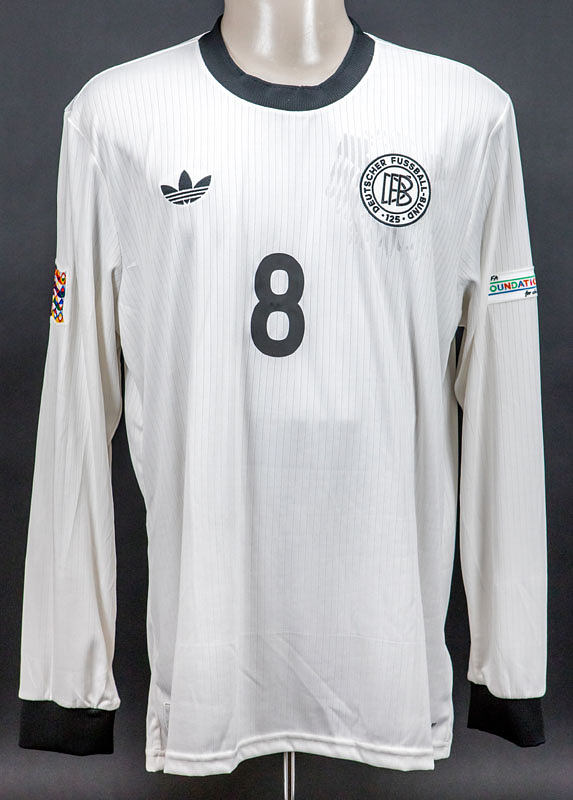 Original match-worn Germany shirt with the number 8. Worn by Leon Goretzka in a UEFA Nations League final round match in the 2024/2025 season. Status: ABB --Long-sleeved jersey; size XL; embroidered DFB 125 logo and adidas logo; rubberized player name and number (front and back); with UEFA Nations League patch and UEFA Foundation for Children 10 Years patch; adidas AeroReady. Jersey comes from the collection of a DFB employee. Condition: A